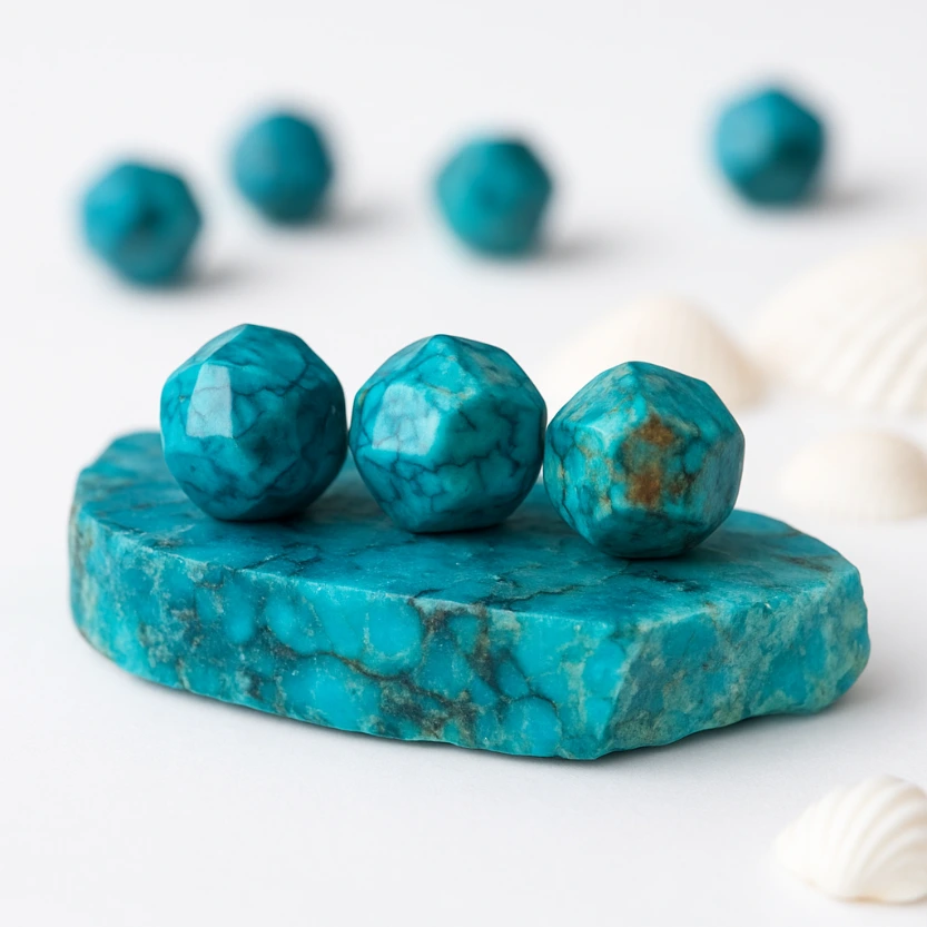La turquoise est une pierre ancienne, née lorsque l’eau chargée de cuivre, d’aluminium et de phosphates circule à travers les roches arides. En s’évaporant, elle laisse derrière elle ce minéral bleu-vert si reconnaissable, marqué parfois de veines sombres comme un dessin naturel.