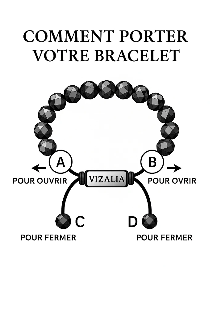 Le mécanisme est conçu pour vous permettre d’ouvrir et fermer facilement le bracelet, en tirant légèrement sur les deux extrémités pour l’ajuster à votre taille. Les perles à facette apportent élégance et reflet, tandis que le pendentif central est marqué du nom Vizalia pour une touche unique et raffinée.